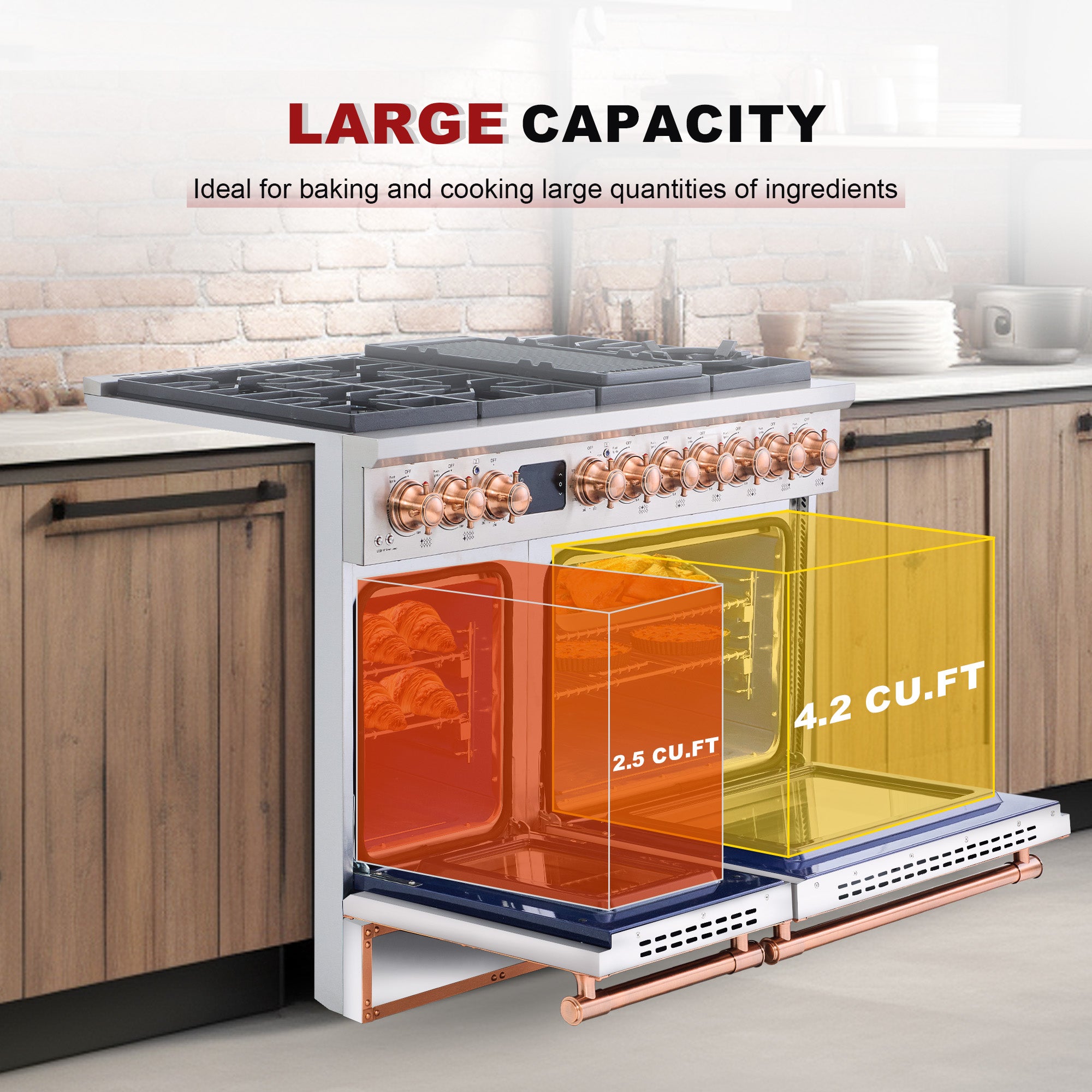 Cook and bake like a pro with this premium gas range featuring two ovens with a total 6.7 cu ft. capacity — a 4.2 cu ft. main convection oven and a 2.5 cu ft. side tube burner oven. Safety features include electronic ignition with auto re-ignition and a double-insulating glass window with halogen lighting.