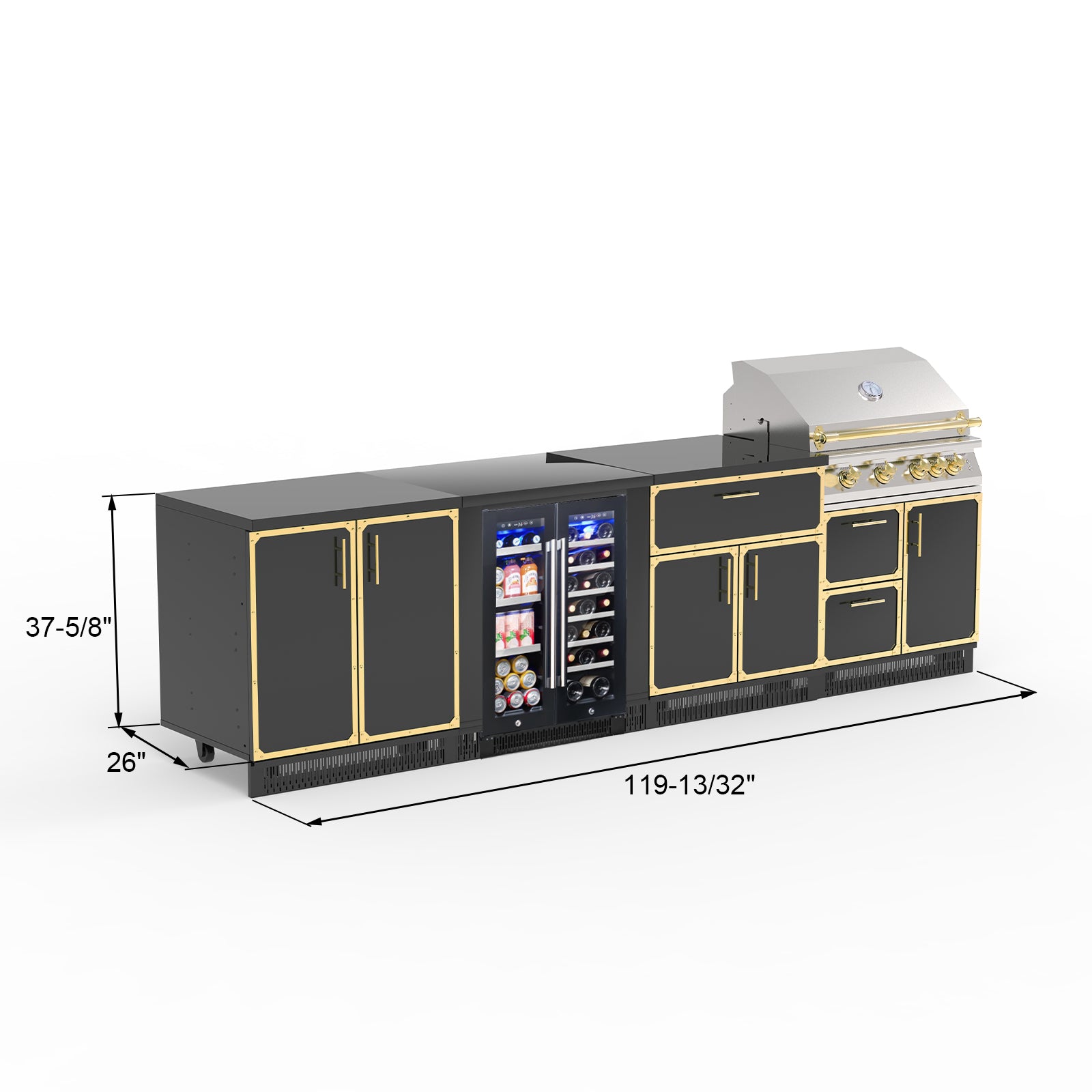 This premium outdoor kitchen set includes a 32" grill, a 32" grill cabinet, a 32" 2-door storage cabinet, a 32" 1-drawer 2-door cabinet, a 24" refrigerator, and a 32" refrigerator cabinet, providing a complete and versatile solution for outdoor cooking and entertaining. Crafted from high-quality 304 stainless steel with soft-close cabinet hardware, this set delivers exceptional corrosion resistance and long-lasting durability.